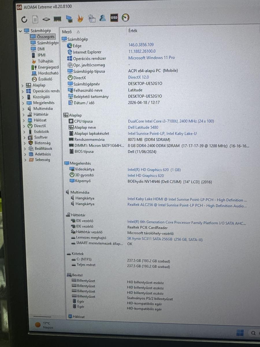 A laptop lelke egy Intel Core i3-7100U processzor. Ez a hetedik generációs, kétmagos (négy szálas) egység az energiahatékonyságra lett optimalizálva. Bőségesen elegendő teljesítményt nyújt a mindennapi feladatokhoz: gördülékenyen futtatja a böngészőket, az Office programcsomagot (Word, Excel) és a videókonferencia szoftvereket (Zoom, Teams).